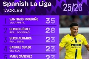西甲解围次数排行:黄潜后卫S-穆里尼奥居首 塞尔吉奥-戈麦斯第二